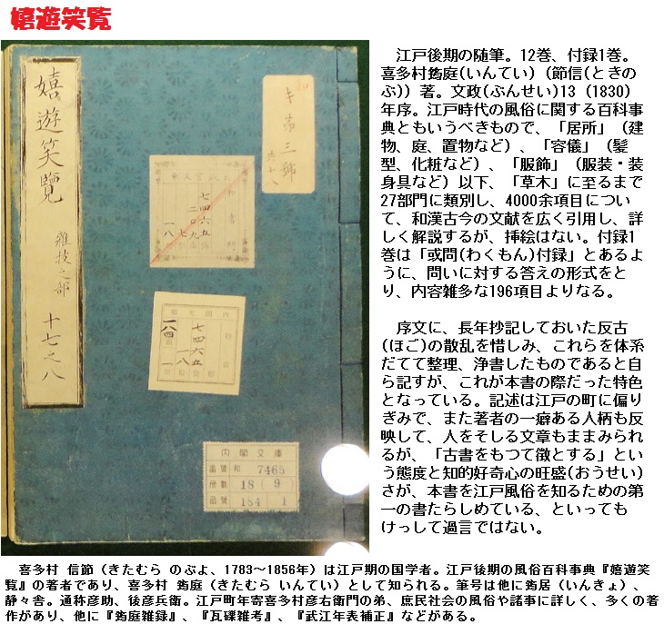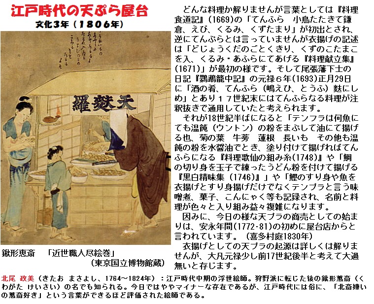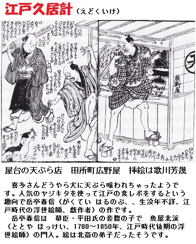 明暦の大火(1657)後の復興過程で、江戸の町には様々な屋台が登場しました。特に防災都市化する過程で各地に設けられた火除地は広小路と呼ばれて盛り場に発展、飲食店が軒を連ねた他、祭りともなれば寺社の門前に、さらに季節の行事毎に人が集まる場所に屋台が集結しました。その屋台の商品の一つとして「すし」「そば」「田楽」「蒲焼き」などとともに売られるようになったのが、「てんぷら」であったようです。記録は下りますが、文政十三(1830)年に出版された、喜多村信節「嬉遊笑覧」に日本橋に屋台を出していた男が鰹を使ったてんぷらを出したという話があり、文久元年(1861)の滑稽本「江戸久居計」にも弥次喜多が屋台の天ぷらを犬に食われてしまうイラストがあります。いつ頃から食べられはじめたのかは十七世紀末から十八世紀半ばまで幅がある。