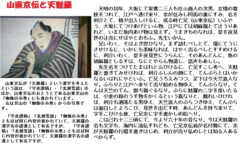 「天ぷら」はポルトガル語で「四季の斎日」を意味する「Tempora(テンポラ)」が語源という説があります。四季の斎日とは季節のはじめの三日間に祈りと節食をする習慣です。この期間中信者は肉を食べる事が禁じられるため、魚などに小麦粉の衣を付けた料理を食べていました。この料理が日本に伝わり「天ぷら」になったと言われています。この他にもポルトガル語で調味料・料理を意味する「Tempero(テンペロ)」や、「あ・ぶ・ら」の当て字で「天〔あ〕・ぷ・ら」など、語源に関しては様々な説があり、どの説が正しいのかはっきりした事はわかっていません。漢字の「天麩羅」は、「天」が「天竺(てんじく)」、「麩」は「小麦粉」、「羅」は薄い衣を表し、天竺から来た浪人が売る小麦粉の薄物という意味で、江戸時代に戯作者の『山東京伝』が考えたものとされるそうです。「天婦羅」の漢字は、「天麩羅」の当て字を変えただけのものと考えられます。