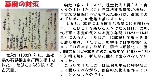 庶民の間に喫煙の風習が広がりはじめた頃、徳川幕府は「たばこ」の禁煙令を発します。この「たばこ」に関するお触れは後に、「たばこ」の栽培の禁止など、幾度か内容を変えて発令されますが、度重なる禁令にも関わらず、「たばこ」を楽しむ人々は増え続け、徳川3代将軍・家光の代となる寛永年間(1624〜1645年)に入ると、「たばこ」に課税して収入を得る藩も現れ、「たばこ」の耕作は日本各地へ広まっていきます。やがて、禁令は形骸化し、徳川綱吉が5代将軍を務めた元禄年間(1688〜1703年)頃を境に、新たなお触れは出されなくなりました。