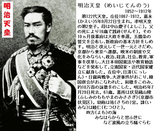 爺が小学生だった頃、この日は四大節(四方拝、紀元節、天長節、明治節)の1つとされ、学校では式典があり、式日の朝には、儀式に参列するためだけに、生徒は晴着で登校しました。式の初めにご真影と教育勅語が、恭(うやうや)しく講堂に担ぎ込まれ、ご真影が開かれ、君が代の合唱後、校長先生によって教育勅語が厳かに読み上げられました。生徒たちは頭を垂れて静かに聞き入ったものです。生徒たちが下を向いているうちにこぼれて来た鼻水をすすりあげる音で、やや厳かさが損なわれることもありました。「アジアの東、日出処、聖の君の現れまして…」と明治節の歌を合唱して、校長先生の訓示があり、ご真影と教育勅語が持ち出され、式典は終わりました。