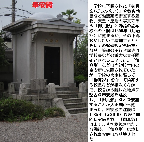 各学校には奉安殿があり、そこには天皇・皇后の写真(御真影)と教育勅語を納められていて、先生も生徒もその前を通る時はお辞儀をしなければなりませんでした。