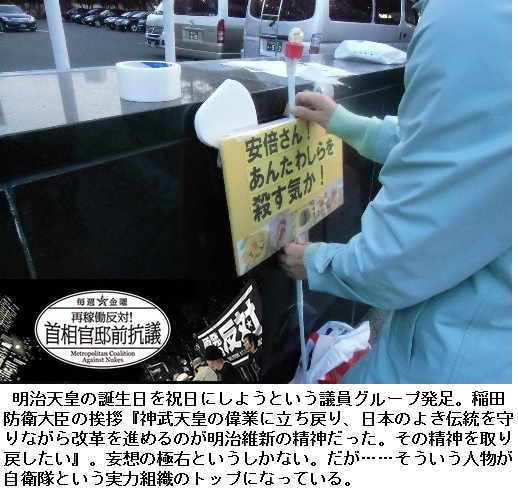 稲田朋美防衛相も「神武天皇の偉業に立ち戻り、日本のよき伝統を守りながら改革を進めるのが明治維新の精神だった。その精神を取り戻すべく、心を一つに頑張りたい」と語った。民進党からは鷲尾英一郎衆院議員が参加した。 (朝日新聞DIGITAL 2016年11月2日00時48分)
