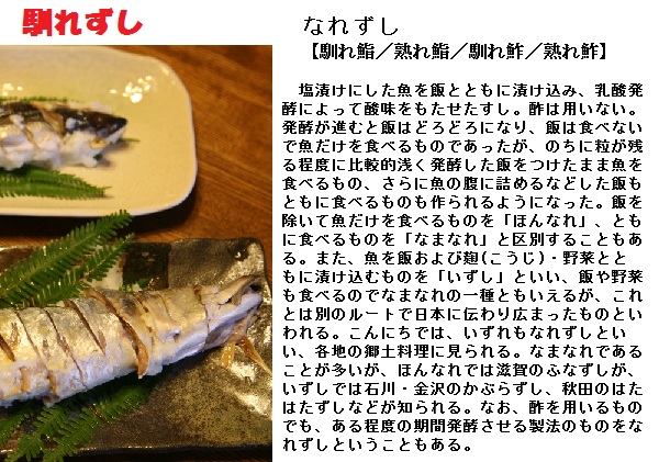 鎌倉時代は生成(なまな)れが登場します。生成れは10日くらいで食べられ、素材はアユ・フナ・ナマズ・コイなどの川魚が中心でした。