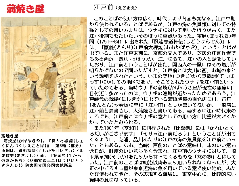 にぎりずしの誕生は、江戸時代の後期、文化年間(1818~1830年)だそうです。握ってその場で食べる・・というのを考案したのは、花屋興兵衛(1799~ 1858年、「与兵衛寿司」を開業した)と伝えられます。日本料理の技術である酢の物(コハダ)や煮物(イカ・穴子)、焼き物(玉子)、蒸し物(アワビ)、刺身(マグロ・ヒラメ)などをすし飯と一緒に食べさせるということを思いついたと云われます。江戸前というとすしの代名詞と思われますが、もとはウナギを指していました。かって江戸城の前は海でしたが、ここを埋め立てた沼でウナギが沢山捕れ、これをぶつ切りにして串にさして焼いて食べさせた店があったことから、江戸城前のウナギと云われるようになったらしいです。その後、にぎりずしが盛んになったので、江戸前ずしとすしにも使われるようになったといわれます。江戸の前の海で捕れる魚を指す言葉です。