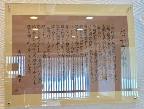 江戸前のにぎり寿司に対して、大阪は押し寿司。バッテラはその代表的な大阪寿司です。明治24年創業、バッテラ発祥のお店『寿司常』の三代目店主がのれんを下ろして(閉店して)から約30年経った同じ場所で、今年(2016年)7月11日に現在の四代目が、再びのれんを揚げることになったそうです。その店内に書道の先生に書いてもらった「バッテラの由来」があるそうです。