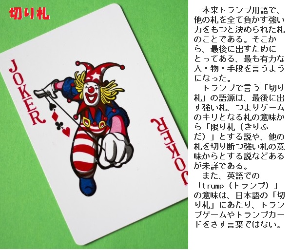 夜会たけなわの鹿鳴館時代のこと、イギリス人たちがカード・ゲームに打ち興じていました。たまたまカードのことを何というのか知らない日本人がいました。かれはイギリス人に向かってその手にある札を指しながら、「それは何というのですか?」と訊ねました。相手のイギリス人はゲームに熱中していたので、自分が手にしている役(やく)のことを聞かれたものと思い込み、トランプ(trump)と答えました。丁度それが「切り札」だったのです。日本人の方は日本人の方は、カード・ゲームのことをトランプというのだな、と勘違いしてしまいます。