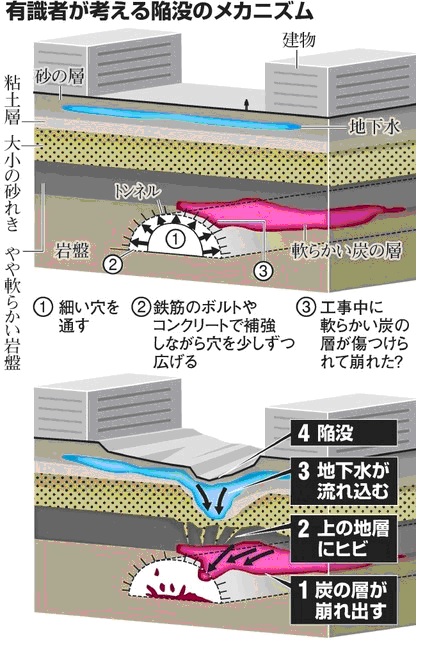 市営地下鉄七隈線の建設技術専門委員会のメンバーの三谷泰浩・九州大教授(岩盤工学)は、「福岡層群には、触るとぼろぼろになるような軟らかい石炭のような層が含まれる。これが陥没の引き金になった可能性がある」と指摘する。