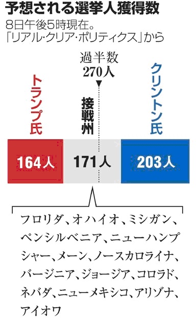 大統領選は、州ごとに割り当てられた計538人の選挙人を勝者総取り方式(2州をのぞく)で取り合い、過半数の270人以上を取れば勝利となる。選挙予測に定評のあるサイト「ファイブ・サーティー・エイト」が、獲得する確率が80%以上と予測した選挙人数(日本時間の8日午後5時現在)は、クリントン氏が223人、トランプ氏は160人となった。