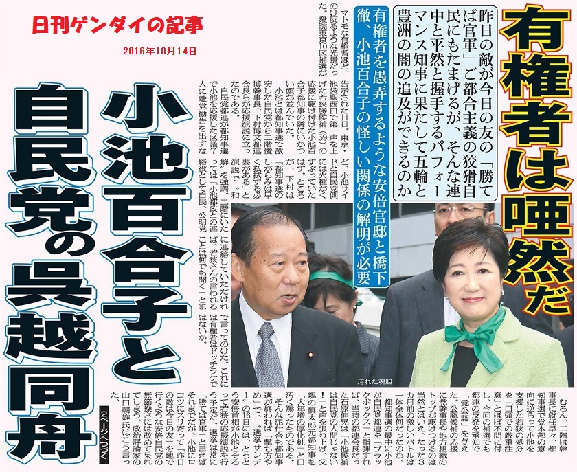 二階氏が「ぜひ小池都知事も若狭氏の選挙について全面的にやってほしい」と求めたのに対し、小池氏も「自分が選対本部長になったつもりで先頭に立って仕切ってやる」と語った。同席した自民党の下村博文都連会長は、小池氏を支援した豊島、練馬両区の区議7人への離党勧告に関し、「補選を通じて考えたい」と述べ、処分緩和も検討する意向を伝達。都知事選で生じた党都連内の亀裂修復への協力も求めた。小池氏は「一気には解決しないだろうが、そういう方向に行ければいいと思う」と、前向きな姿勢を示した。 (jiji.com 2016/10/06-16:17)