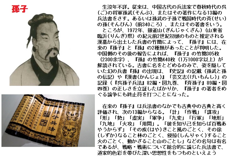 故(ゆえ)に善く兵を用うる者は、譬(たと)えば率然の如し。率然とは、常山の蛇なり。其の首を撃てば則(すなわ)ち尾至り、其の尾を撃てば則ち首至り、其の中を撃てば則ち首尾倶に至る。あえて問う、兵は率然のごとくならしむべきか。曰く、可なり。それ呉人と越人と相悪むも、その舟を同じくして済(わた)り風に遇(あ)うに当たりては、その相救うや左右の手のごとし。このゆえに馬を方(なら)べ輪を埋むるも、いまだ恃むに足らず。勇を斉(ひと)しくし一(いつ)のごとくするは政(せい)の道なり。剛柔みな得るは地の理なり。ゆえに善く兵を用もちうる者は、手を携さうること一人を使うがごとし。已(や)むを得ざらしむればなり。