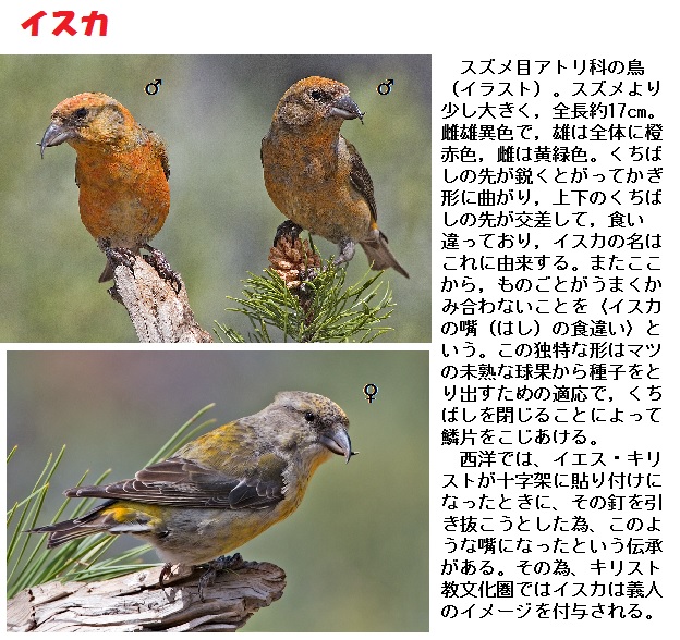 鶍(いすか)はスズメ科の小鳥で、針葉樹の実を食べやすいように上下のくちばしがくい違っているため、行違うという意を持つ“易”の字と鳥を組み合わせたものです。