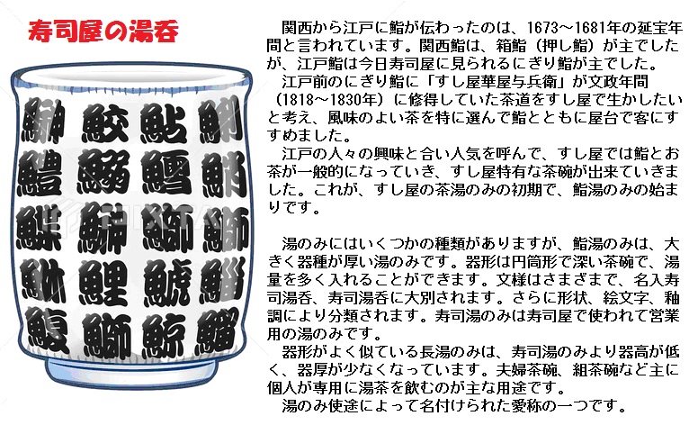 寿司屋の湯呑には魚の名がいっぱい書かれたものがありますが、みなさんはどれぐらい読めますか?