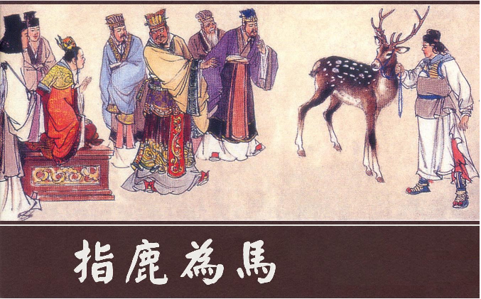八月己亥。趙高欲為亂。恐群臣不聽。乃先設驗。持鹿獻於二世曰。馬也。二世笑曰。丞相誤邪。謂鹿為馬。問左右。左右或默。或言馬。以阿順趙高。或言鹿者。高因陰中諸言鹿者以法。後群臣皆畏高。
