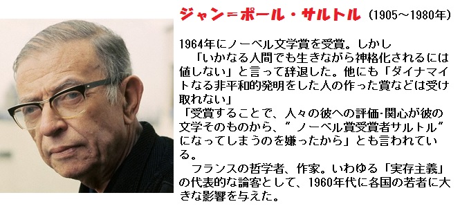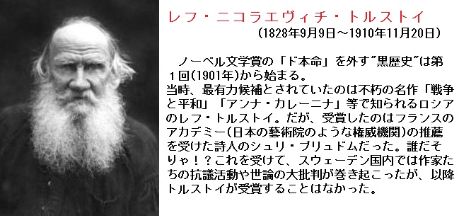 このため自分の意思で辞退したのは、6人のうちレ・ドク・トとサルトルの2人だけということになる。ただ、公式サイトによると、ロシアの文豪トルストイも1910年の死去まで繰り返し推薦を受け候補となったが「本人が望まず、授与が決まっても辞退すると述べた」と付記されている。 (jiji.com 2016/10/18-14:28)