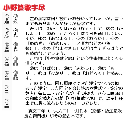 同じ原理でできた漢字や字形の似通った漢字、また同字を含む熟語や世話字・宛字の類を行毎に二~五字(語)ずつ掲げ、さらに暗誦用の和歌を添えたのが『小野篁歌字尽』で、語彙科往来では最も流布したものの一つでした。