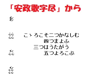 歌字尽はいくつも出版されましたが、『安政歌字尽』ように『小野篁歌字尽』と共通する字がほとんどないものが現われます。これは序文のように意図的に『小野篁歌字尽』中の漢字を避けた結果であるといいます。本書は意図的に『小野篁歌字尽』の漢字を排除したため、所収の漢字に俗字がとりわけ多いのが特徴です。例えば、末尾には、添付図のように「心」という漢字をいくつも並べた俗字を掲げています(それぞれ読みは「かなしむ」「まよう」「うたがう」「よろこぶ」)。ほとんど謎掛けのような甚だしい俗字ばかりです。