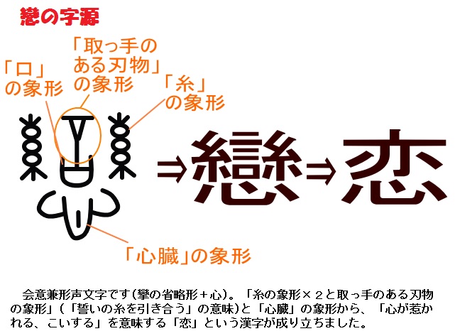 「戀」は「恋」の旧字(以前に使われていた字)です。昔の絵文字を見てみると、男女が心の糸をお互い引っ張り合っている様が現在の「恋」という漢字の起源である事がわかります。よく愛し合っている恋人同士を「赤い糸で結ばれている」という言葉がありますが、「糸」を引き合うという表現は紀元前から使用されていた事がわかります。