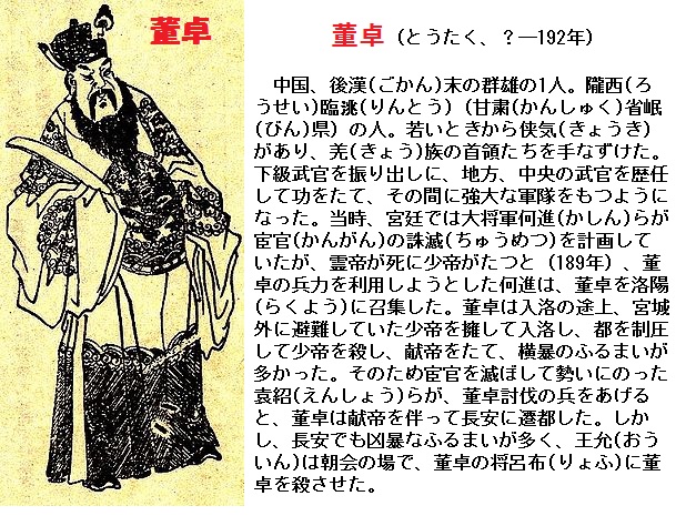 「獻帝踐祚の初、京都の童謠に曰く、千里の草、何ぞ青青たる。十日卜するに、生きるを得ざらんと。案ずるに、千里草は董と為し、十日卜は、卓と為す。凡そ別字の體は、皆な上より起り、左右に離合す。下より端を發する者有る無きなり。今二字此くの如き者は、天意に卓は下よりして上を摩し、臣を以て上を陵ぐと曰ふが若きなり」とあります。