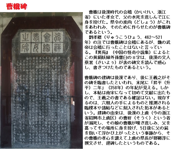 3、魏の武帝(曹操)は、ある時曹娥の碑のそばを通りかかった。楊脩が随行していた。その碑の裏面に「黄絹・幼婦・外孫・齏臼」の八字が刻まれていうのを見て、武帝は脩に言った。「わかるかね。」