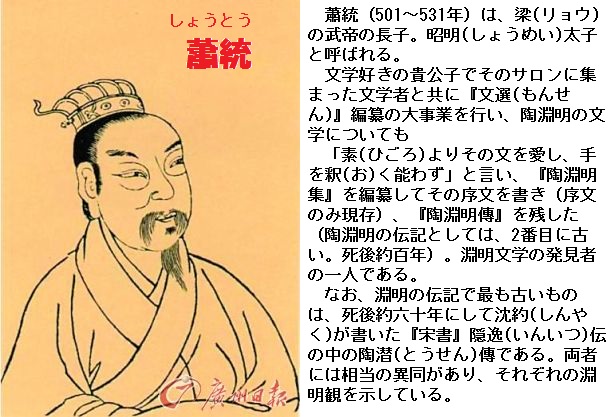 蕭統(しょうとう)の『陶淵明伝』に「淵明、少(わか)くして高趣(こうしゅ)あり、……曾(かつ)て『五柳先生伝』を著して以って自(みずか)らに況(たと)う。時の人これを実録と謂(い)えり」とあります。
