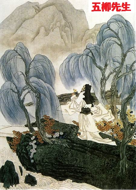 ムカシノ隠者黔婁ノ妻ノコトバニ「貧乏ヤ低イ身分ニクヨクヨセズ、財産ヤ高イ地位ニアクセクセヌ」トイウ。ソレハマッタク先生ノヨウナ人物ヲイウノデアロウ。酒ニ酔ウテハ詩ヲ作リ、オノガ心ヲ楽シマセタ。古代ノ帝王無懐氏ノ民デモアルカノヨウニ、マタ葛天氏ノ民デデモアルカノヨウニ――。