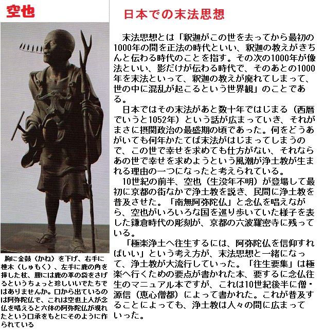 その後政権を争う戦いが長く続き、その不安から人々の間で“1052年に仏の教えが消滅してしまう”という「末法思想」が広まり、社会現象になり始めました。信者達は、現世で報われないのなら、せめて死んでから極楽浄土へいけるようにとすがるようになりました。初めは浄土宗の人たちだけの信仰だったようですが、あまりにも戦乱が長く続いたため一般の人にまで広がりました。