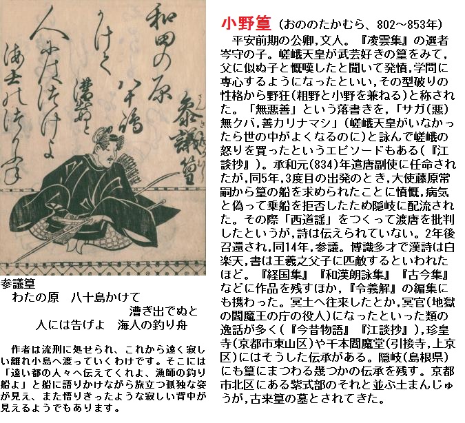 福井県三方上中(みかたかみなか)郡若狭町には、「無悪(さかなし)」という地名があって、小野篁(たかむら)に由来すると言われています。嵯峨天皇の怒りを買い、隠岐へ流罪となった小野篁は、隠岐から帰郷中に暴風に遭って小浜に漂着、そこから三年間、無悪で過ごしたと言います。地元の人から愛され人望があった小野篁は、当時嵯峨天皇が在位していなかったら無罪だったろうという意味で、この地が「さかなし」と名付けられたというのです。