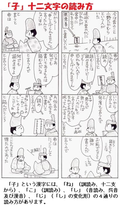 (篁は)、「なんでも、きっと読みましょう。」と申し上げたところ、(天皇は)片仮名の子の文字を十二個お書きになって、「読んでみろ。」とおっしゃったので