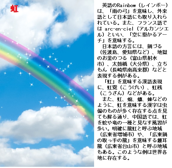 鯨が私達人間の仲間の哺乳類であると断じ、虹が水と光がおりなす化学現象であると理解するところに文化的で近代的な人間生活があるのです。生活表現としての言葉もこのようにあってこそ本来の役割がつとまるのでしょうね。