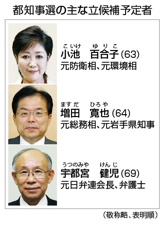 都知事選をめぐっては、自民党都連が増田寛也元総務相(64)を推す方針。同党の小池百合子元防衛相(63)も出馬表明している。(2016/07/12-13:11)