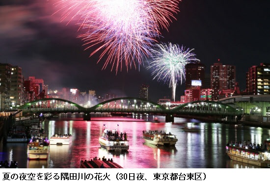 2万発の大輪に歓声 隅田川花火大会、警備を強化 ―― 東京の夏の風物詩、隅田川花火大会が30日、台東区と墨田区にまたがる会場で開かれた。東京スカイツリーや浅草寺周辺では、約95万7千人(主催者発表)の見物客が夜空に咲いた約2万発の大輪に見入った。