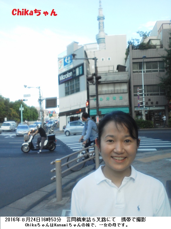 昨日は、買い物にLifeまで出掛けました。帰りに言問橋東詰めの交叉点で信号を待っていると、「先生!」と呼ばれて、振り向くとそこに塾生のChikaちゃんの顔がありました。昨年の暮れに姉のKanamiちゃんと我が家にお節料理を届けてもらった時に逢って以来の久しぶりの対面でした。取り敢えず、携帯にChikaちゃんの姿を納めました。