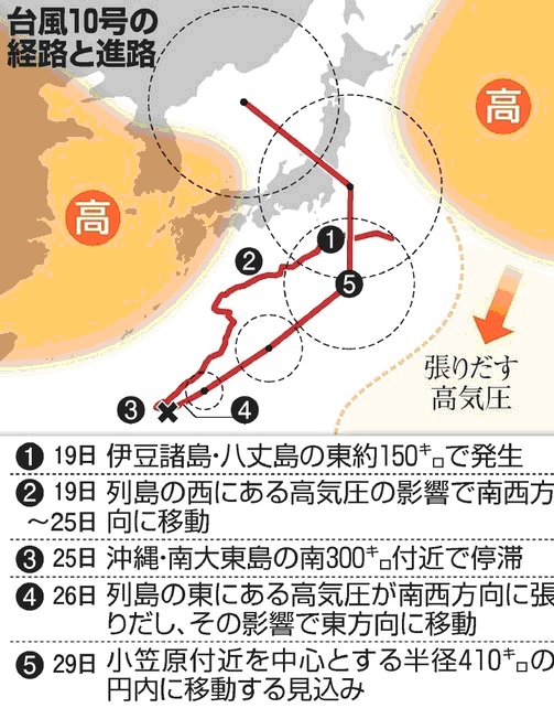 台風10号は八丈島東で19日に発生。列島を挟む東西の高気圧に進路を阻まれ、南西方向に進んだ。25日、南大東島の南で停滞していたが、26日、進路を東に移した。東側の高気圧が南西に張り出し、その縁を北東方向に流れる風に沿って移動を始めた。