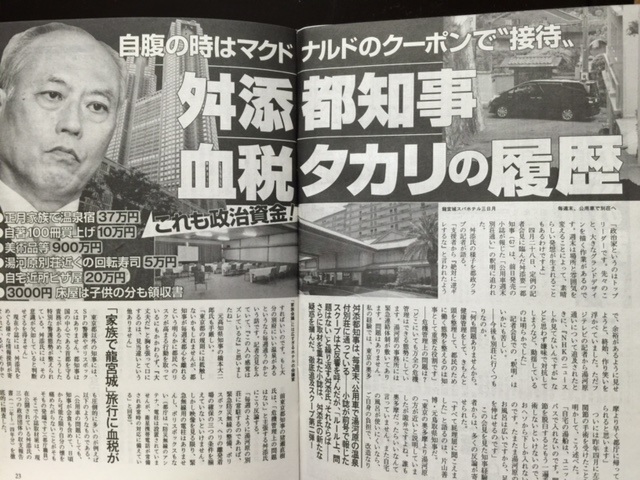 舛添氏の公私混同問題を巡っては、高額な海外出張旅費や公用車での毎週末の別荘通いなどが判明していた。