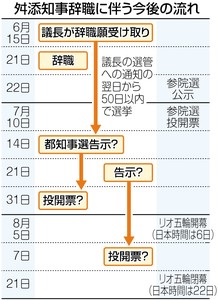 舛添氏はこの日午前、都職員を通じて川井議長に辞職願を提出した。これを受け都議会は不信任案を取り下げた。