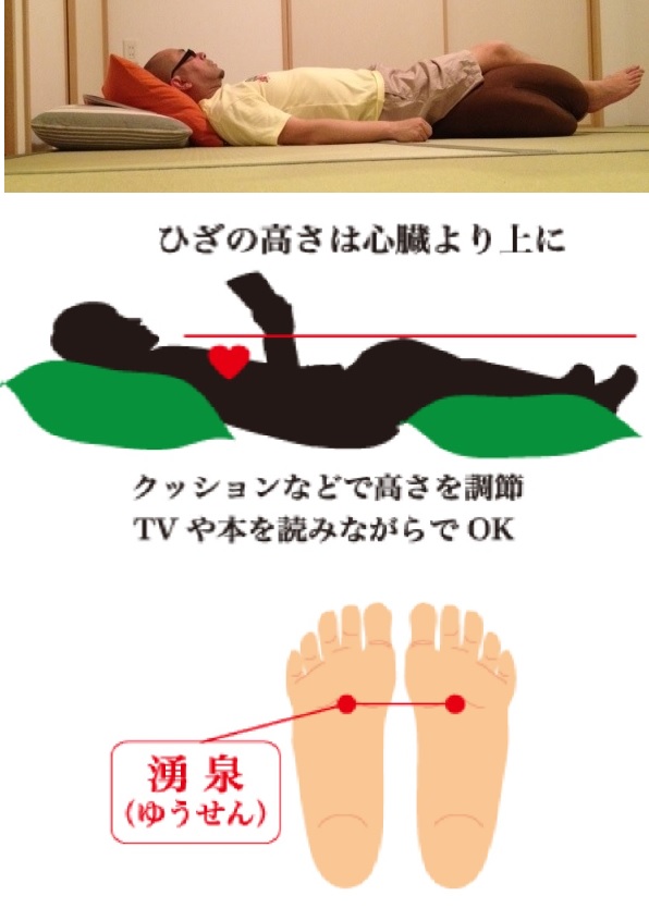 押し方ですがまず 床に座って膝を軽く曲げて両手の中指で湧泉を押さえながら足をもち上げます。ツボを押さえた状態で膝を曲げては伸ばし、伸ばしては曲げる動作を繰り返します。これを左右1分~2分位。呼吸は普通で大丈夫だそうです。