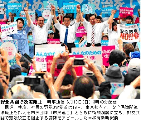 都知事選も4野党共闘=民進に「実務型」推す声 ―― 民進、共産、社民、生活の野党4党は21日、幹事長・書記局長会談を衆院議員会館で行い、東京都の舛添要一知事辞職に伴う出直し知事選(7月14日告示、同31日投開票)への対応について、参院選同様、4党が一致して推せる候補者を擁立する方針を決めた。(時事通信 2016年6月21日(火) 16時49分掲載)