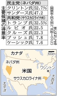 クリントン氏・トランプ氏2勝目 米大統領選・指名争い第3戦 ―― 【ラスベガス(米西部ネバダ州)】米大統領選の指名争いは二十日、第三戦を行い、民主党は西部ネバダ州の党員集会でヒラリー・クリントン前国務長官(68)が勝利。南部サウスカロライナ州で予備選を行った共和党は、不動産王ドナルド・トランプ氏(69)がニューハンプシャー州予備選に続いて連勝した。