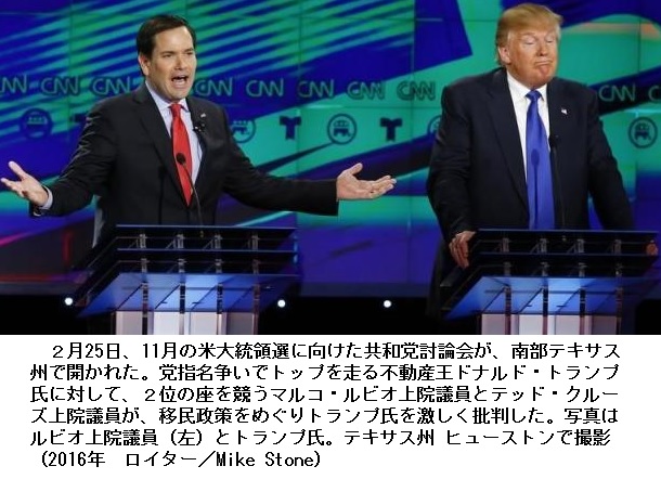 米共和討論会、移民政策めぐりトランプ氏に激しい批判 ―― [ヒューストン 25日 ロイター] - 11月の米大統領選に向けた共和党討論会が25日、南部テキサス州で開かれた。党指名争いでトップを走る不動産王ドナルド・トランプ氏に対して、2位の座を競うマルコ・ルビオ上院議員とテッド・クルーズ上院議員が、移民政策をめぐりトランプ氏を激しく批判した。