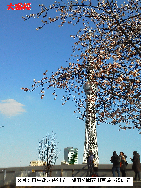 いつの間にかすっかり春めいて来て、隅田公園では大寒桜が咲き始めました。