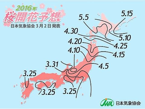 日本気象協会、2016年の桜の開花と満開予想日を発表 ―― 3月22日の愛媛県宇和島から開花スタート。4月上旬には関東より西のエリアでお花見シーズンに。