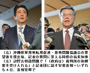 安倍晋三首相は四日、沖縄県名護市辺野古への新基地建設をめぐり和解案の受け入れについて「国と沖縄が延々と訴訟合戦を繰り広げている関係が続けば、結果として膠着(こうちゃく)状態となり、普天間が何年も固定化されかねない。そんなことは誰も望んでいないとの裁判所の意向に沿って和解を決断した。和解内容を誠実に実行することとし、中谷元・防衛相に指示した」と説明した。