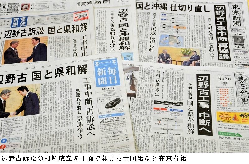 朝日、毎日、東京、読売、産経新聞の5紙は1面トップ、日本経済新聞も1面に4段見出しで報じた。各紙とも2、3面の政治面などで和解を受け入れた政権の思惑、なお溝が深い県と国の協議の行く末や米国の反応などを伝えた。