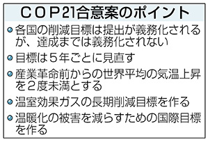 COP21 閣僚交渉たたき台公表 ―― 【パリ=垣見洋樹】二〇二〇年以降の新たな地球温暖化対策を話し合う国連気候変動枠組み条約第二十一回締約国会議(COP21)で五日、七日から始まる閣僚級会合のたたき台となる合意案が公表された。先進国と発展途上国が負う義務にどの程度差をつけるかなどに関し、なお多くの対立点が残されたままとなった。