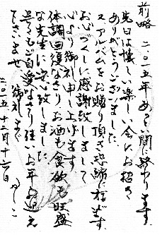 前略/昨日は大変楽しい時間を過ごすことができました。/お話をしているうちに、蘇る記憶もあり、あらためて小学校時代の自分を振り返る時間だったと思います。/お約束の臨海学校文集「想い出 昭和42年度」を同封送付します。/読み返すと懐かしいいですね。/向寒の折、ご自愛ください。/取り急ぎ、御礼まで 草々/平成12年12月11日/日高先生・奥様 KO