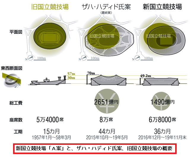 具体的なポイントとして挙げられているのが、3層のスタンドだ。観客の見やすさを重視するとともに、工事が比較的容易なため工期短縮にもつながるともされ、A案の売りでもあるのだが、ザハ氏側はこれが旧案を参考にしたものだと主張する。確かに、ザハ氏の構想でもスタンドは3層となっており、A案のチームに入っている大成建設は、旧案でスタンドを担当する予定だった。