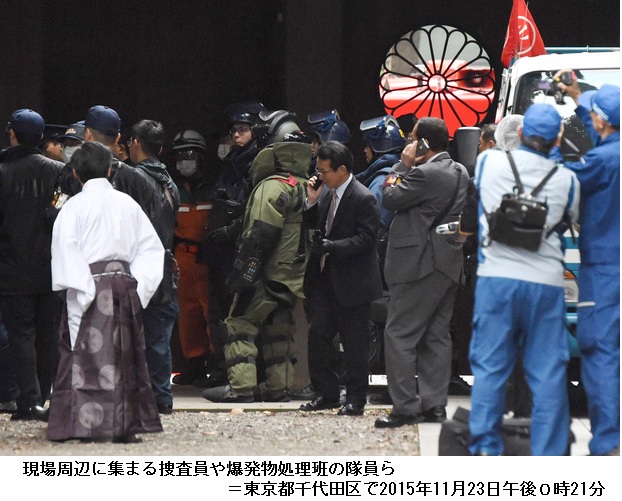 この日、靖国神社で行われた新嘗祭に参加した50代の男性は、「パン」と乾いた音を聞いたという。その後、消防車のサイレンが鳴り響き、宮司から「こんな日に残念だが、爆発騒動があった」との説明があったという。男性は「宗教にかかわりなく、こんなことをするなんて非常識で許せない」と話した。