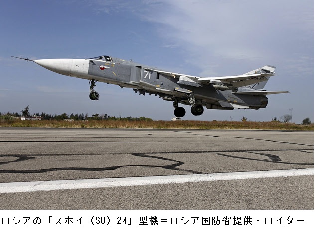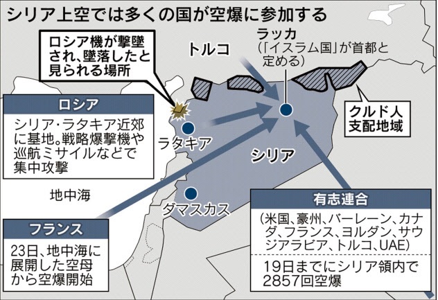 「イスラム国」包囲網に亀裂 トルコ、ロシア軍機撃墜 ―― 【モスクワ、ドバイ】トルコ軍が24日、シリア国境付近でロシア軍機を撃墜したことで、過激派組織「イスラム国」(IS=Islamic State)との戦いをめぐる国際協調に亀裂が入るのは避けられそうにない。ともにIS打倒を掲げてきたトルコとロシアは、もともとシリアのアサド大統領の去就をめぐって対立してきた。異なる思惑でシリアに軍事介入する各国間の緊張が高まる可能性がある。