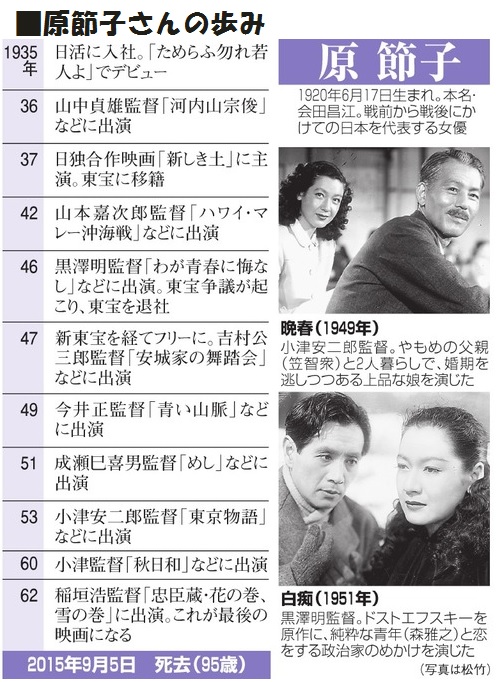 原節子さん死去95歳 伝説の女優「東京物語」「晩春」―― 戦前から戦後にかけて銀幕のトップスターとして活躍し、42歳の若さで突然引退した後は「伝説の女優」といわれた原節子(はら・せつこ、本名会田昌江〈あいだ・まさえ〉)さんが9月5日、肺炎で死去していたことがわかった。95歳だった。葬儀は近親者で営んだ。