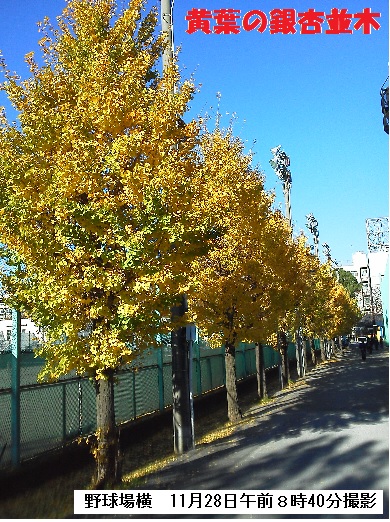 昨日は久しぶりに桜橋通りからスカイツリーを一回りして、言問橋を渡って帰宅しました。野球場とテニスコートの間の銀杏が見事に黄葉していたので、携帯に収めてみました。